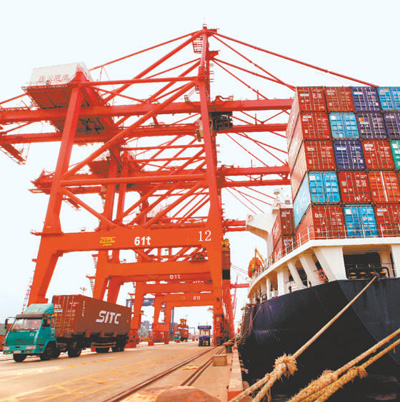 2013年中国首次成为世界第一货物贸易大国,作为全球第一大出口国、第二大进口国,出口市场份额保持13%以上。图为远洋运输货轮在江苏连云港港口集装箱码头卸载进口货物。 |