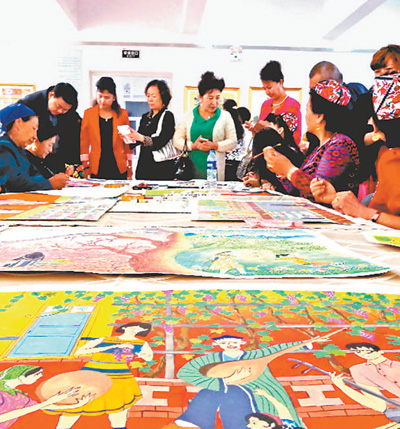 全面建成小康社会,不但要拉动城乡居民的生活消费,还要拉动城乡居民的文化消费。近年来,各地不断建设和完善基层公共文化服务体系和设施。图为2014年9月,新疆基层公共文化建设服务工作交流活动中,代表们在参观农民画制作。 |