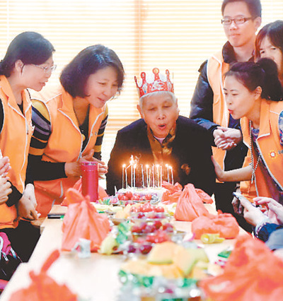 建成全面小康,就是要有更好的教育、更稳定的工作、更满意的收入、更可靠的社会保障、更高水平的医疗卫生服务、更舒适的居住条件、更优美的环境。图为2017年4月,在福建省福州市台江区福机新苑居家照料中心,老人过生日。 |